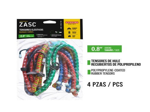 TENSORES ELÁSTICOS 0.8X60CM VARIOS COLORES 4PZAS UNID ZASC